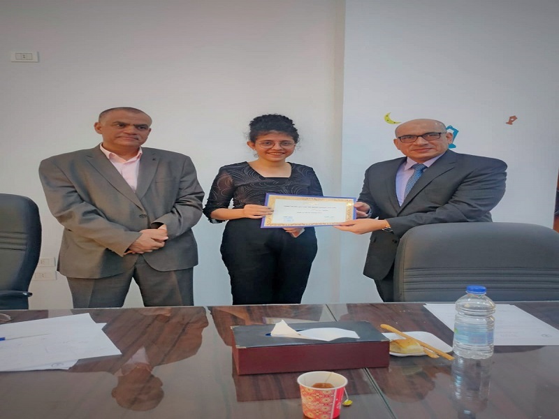 مناقشه اول رساله الماجستير للباحثه ايه محمد عبد الله المعيده بقسم جيولوجيا المياه والبيئه بكليه علوم الأرض تحت عنوان تطوير أغشية النانو المركبة وتطبيقاتها فى تحليه مياه الصرف الزراعى : تل ابو ناروز ، بنى سويف ،مصر